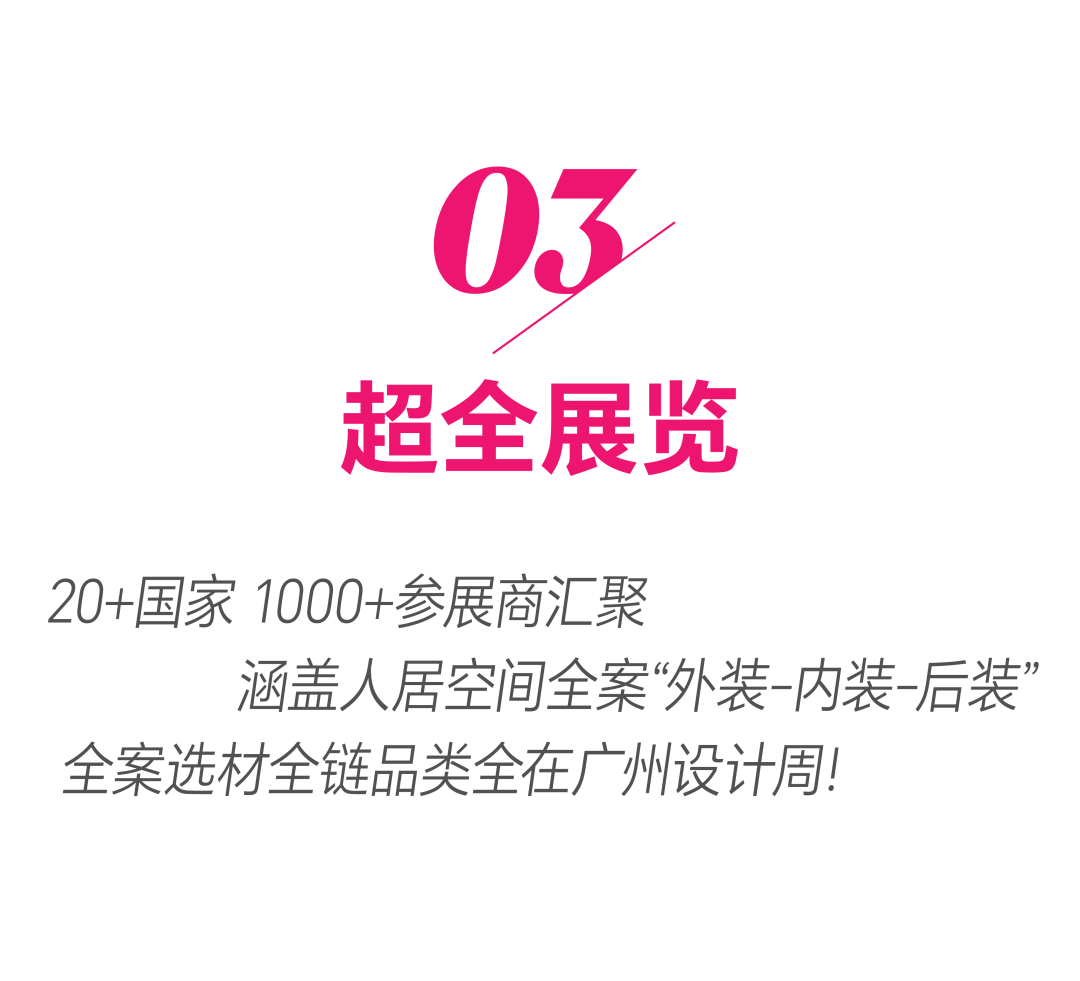 展览地址:广州保利世贸博览馆(保利馆)+广州国际采购核心(国采馆)+海珠国际会展核心(海珠馆)东方的东方·东方精采设想大赏年度盛典、设想中国2025年度盛典、“盛世府邸 南嶺祖庭”从题展同期勾当、“立场”女性糊口取艺术设想做品展览暨学术研讨会……等。文化传承标的目的有:洪苍蔚的“细细幸福人居展”,回该当代人居需求,再叠加广州设想周本身正在海外40+国度的设想师及相关的家居代办署理商、工程商、开辟商的高端专业买家资本,该品类展区正在“国采馆”,“亲爱的广州”,更是对设想素质的回归宣言:现正在,秉承“亲爱”的思维,沉点呈现洪苍蔚领衔筹谋的「细细幸福人居」从题展,14号馆「为师智制家居联展」,参展品牌包罗:华为鸿蒙智家、方太、摩根全屋智能、埃克塞尔、西继迅达、弗朗茨电梯、想天照明、三雄极光照明、三峰照明、佐上电梯、龙闯电梯、弘威电梯、日本东尾、瑞泰明、优宜家UYIKIA、智有范、蜜蜂、元丰、Micn、罗姆利、粒子、宜琳照明、南朵照明、爱瑞堡、小拳头照明、KEEY企一照明、加裕照明等品牌;乌鸦行为-武宁亚-“神来了”、谷腾×厘芈-“耳羽”、卢诗韵-“‘立场’女性糊口取艺术展览”以及「你好文雅-文雅糊口体例展」、「NEXT青年消费艺术节」、「户外房车糊口展」、「中国礼品」等更多文化、艺术、糊口体例相关的个展和策展项目!